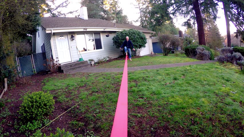 Backyard slackline. How to setup a slackline without trees. The slackline is tethered to two trees like a tightrope but is flat stretchy and bouncy. This versatile backyard outdoor hanging obstacle course kit allows the obstacles to be moved.