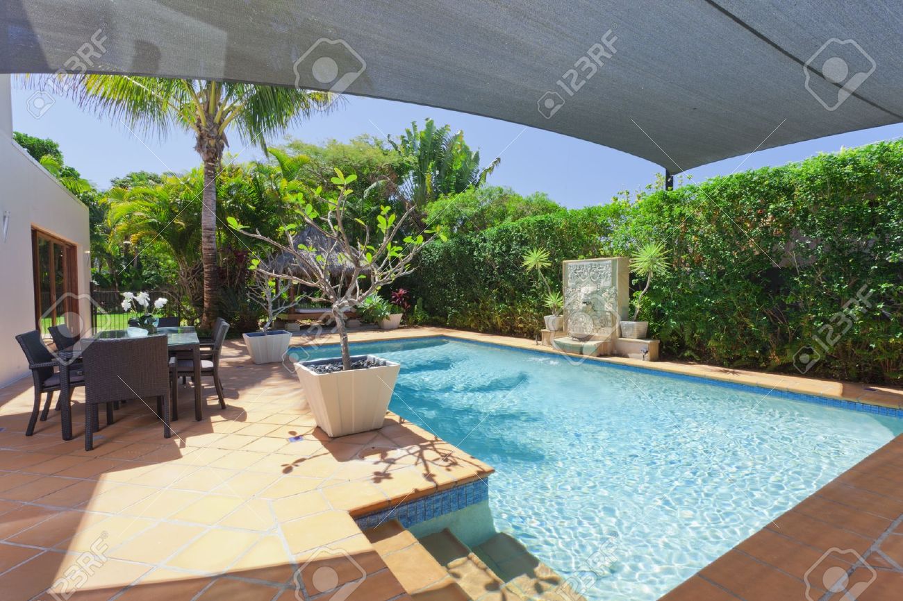 Modern Backyard With Swimming Pool And Entertaining Area In
